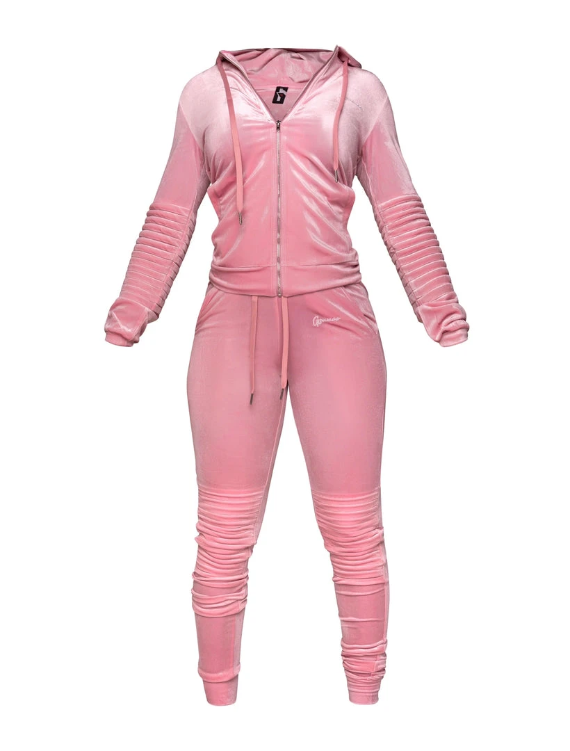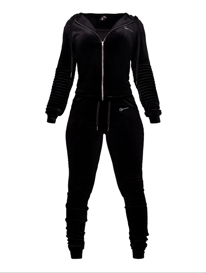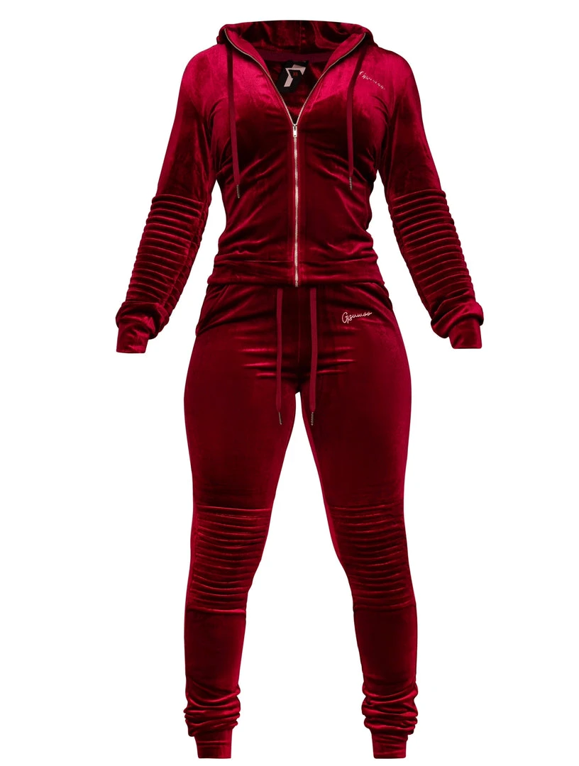 Suave is our latest velour tracksuit composed of a hoodie and matching joggers. Suave features velvet ribbed patchwork on the sleeves of jacket and on the knee area of bottoms. Our signature Gsuwoo logo is embroidered in white on the top and bottom of the set. This set can be worn by both women and men.