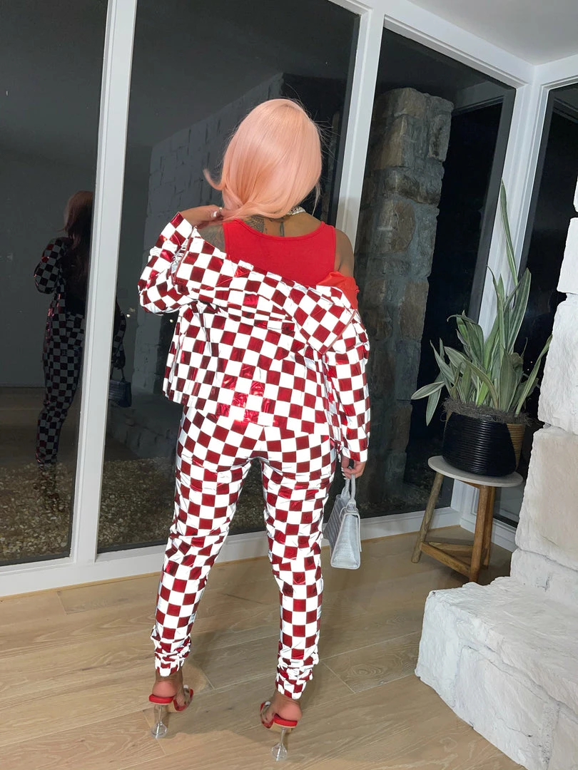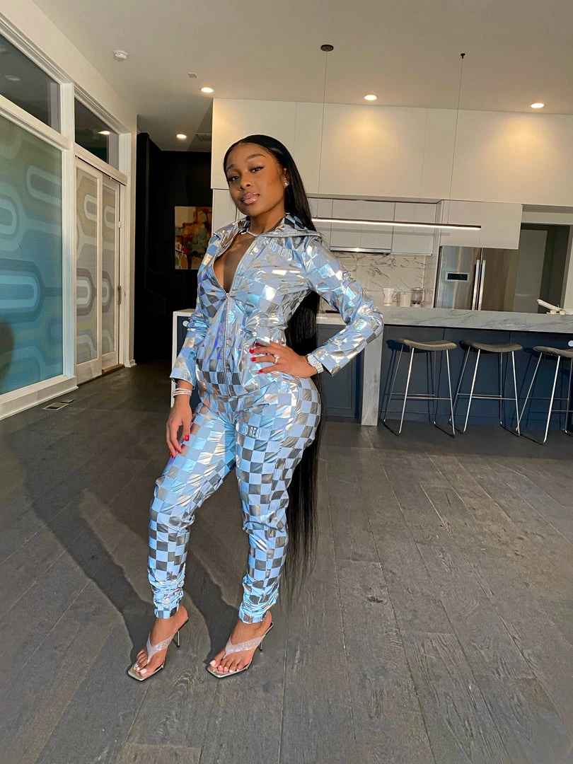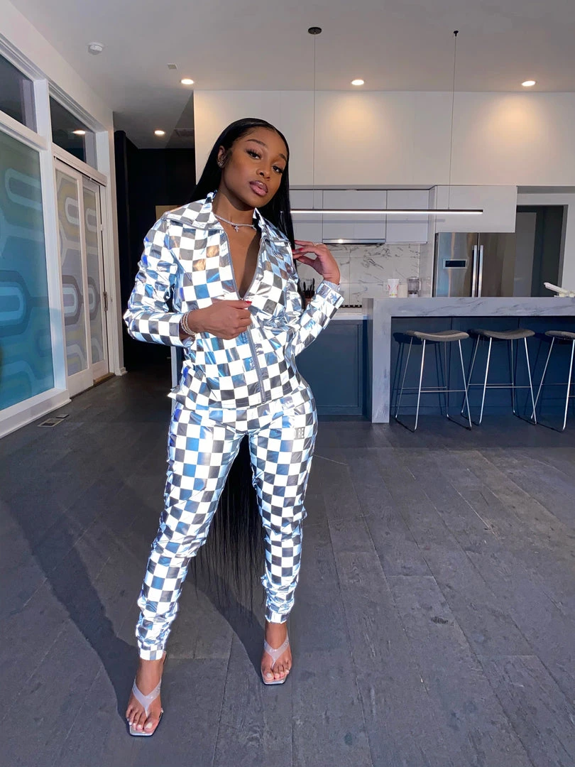 Are you playing Checkers or Chess? Our new Check Mate setĀ is the statement piece you have been looking for! Made from reflective material this unique piece has a Checker board pattern. Our Check MateĀ Set comes as a two piece set top and bottom can ban be worn together or separate.