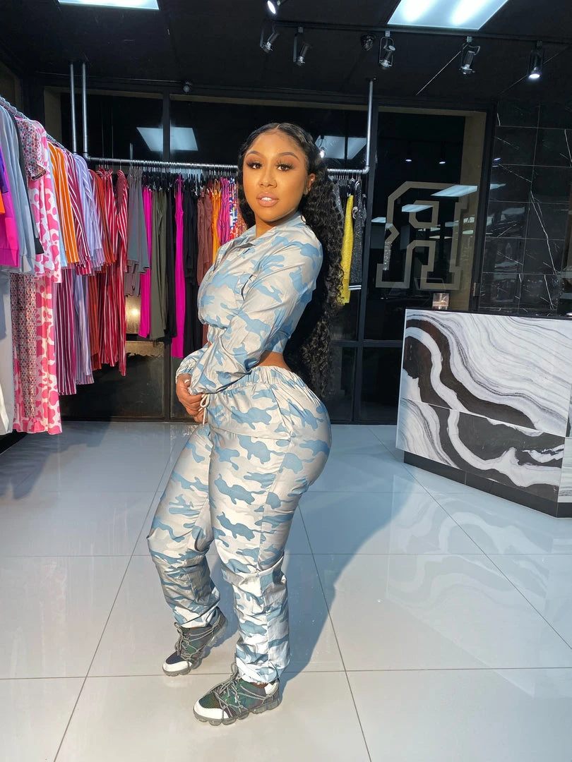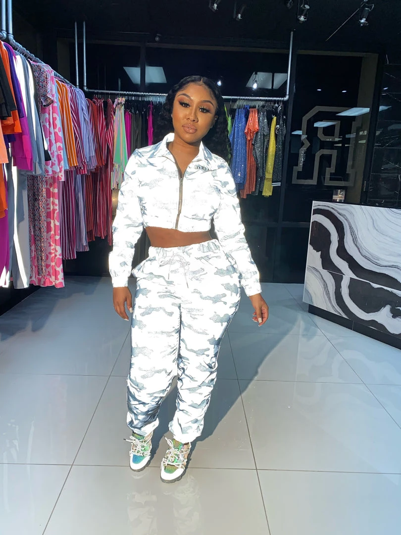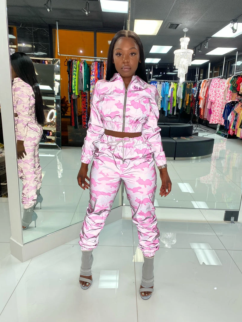 Stopping the show! Stop the Show in our new Reflective Camo set! Our new Reflective sweatsuit is made reflective material and comes as a two piece jacket and jogger pants. The collard jacket is zippered and cropped, and the jogger pants are fitting with cuffs.
